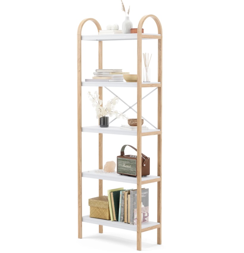 Bløde kurver: Denne moderne fritstående hylde har fem hylder med buede bøjede accenter; hver hylde kan rumme 29 lbs (13 kg)