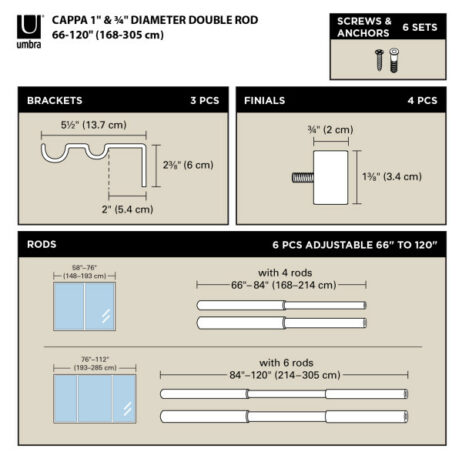 NEM INSTALLATION:Din justerbare Cappa gardinstang leveres med alt, hvad du behøver for hurtigt at komme i gang, herunder teleskopstænger, 4 endeknopper, vægmonterede gardinstangsbeslag, skruer, rawlplugs og en letforståelig installationsinstruktion.