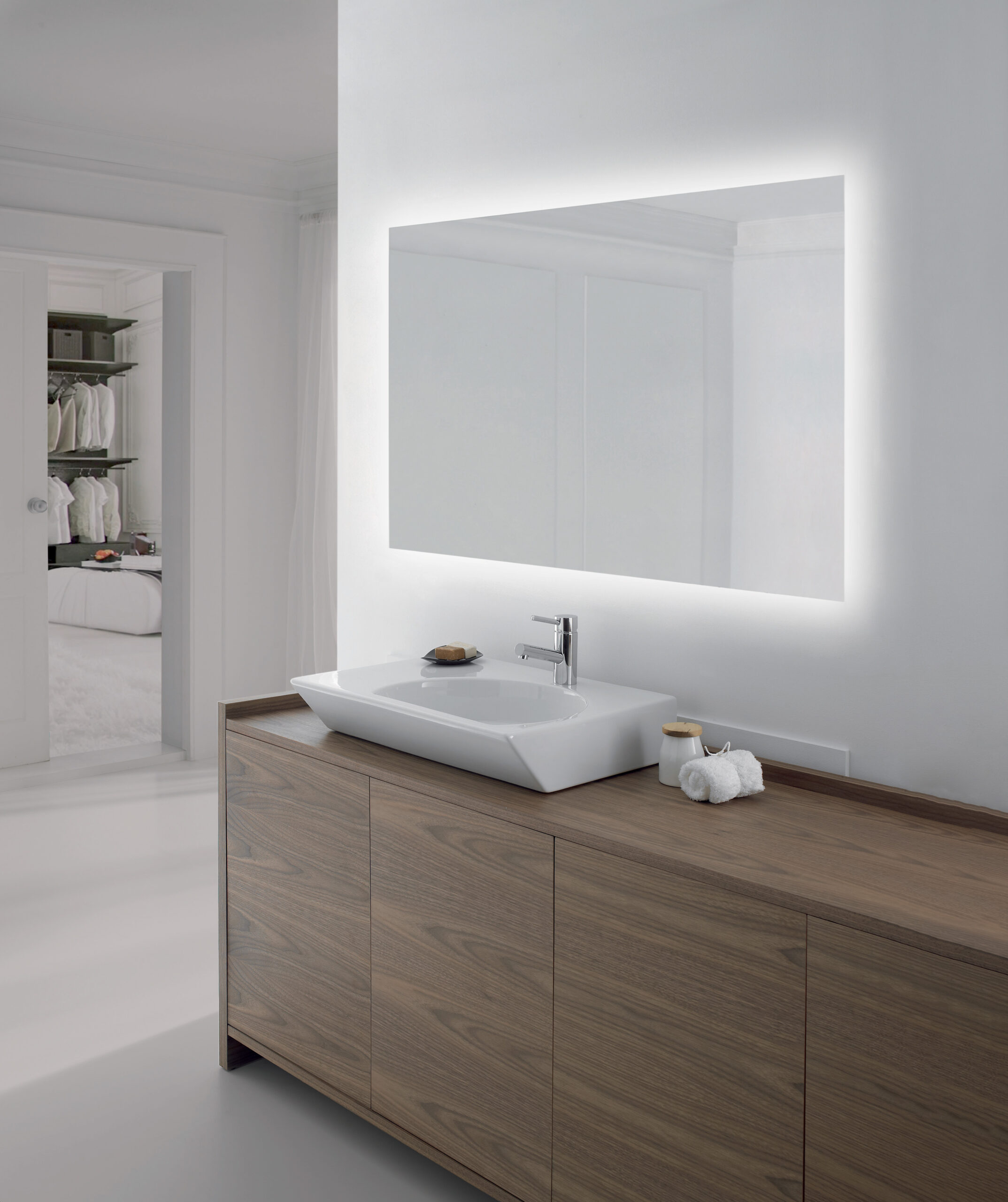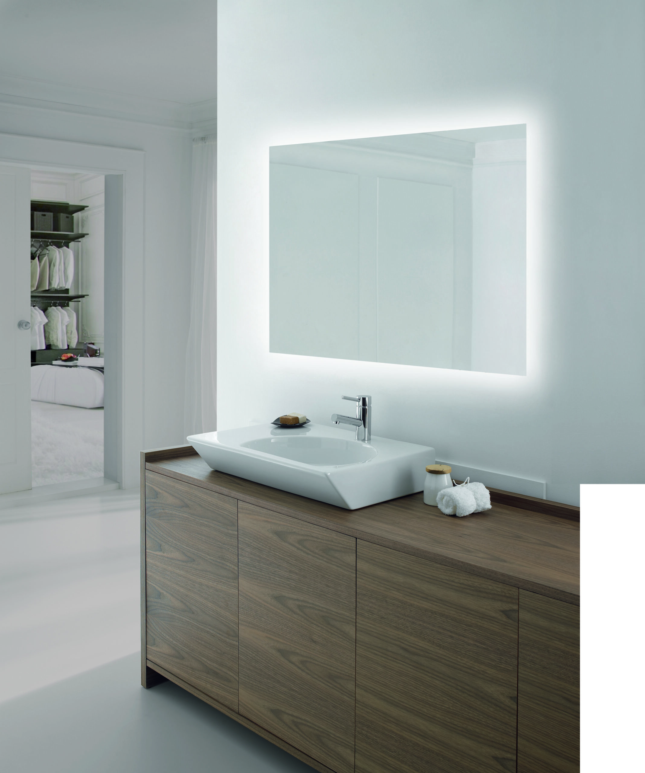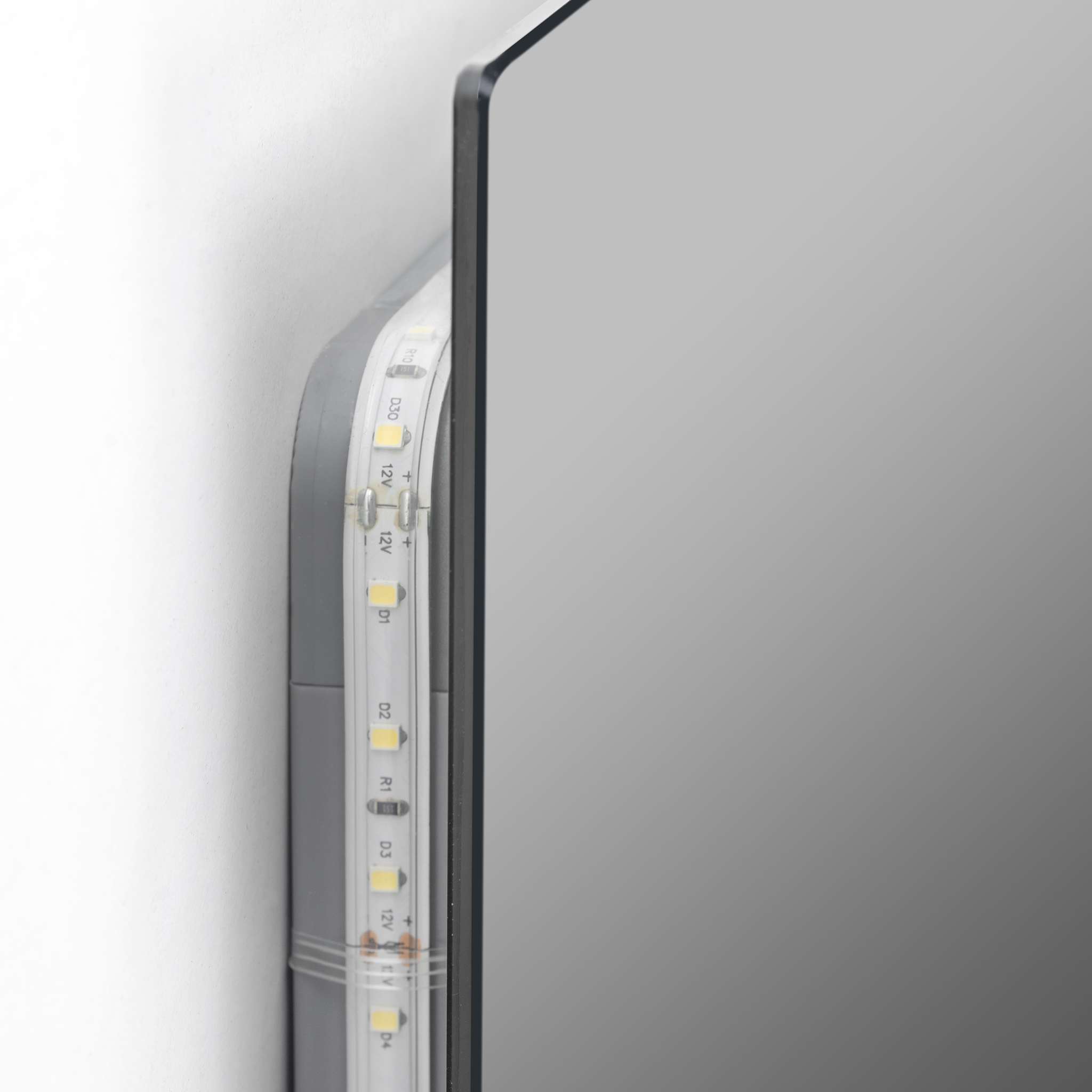 Spejlet ophænges på væggen ved, at skrue to skruer i væggen, herpå hægtes beslagene der er fastgjorte bagpå spejlet. Al elektronik, herunder LED drivere m.m. er fastgjort på spejlets bagside, det medfølgende kabel tilsluttes direkte til 230V.