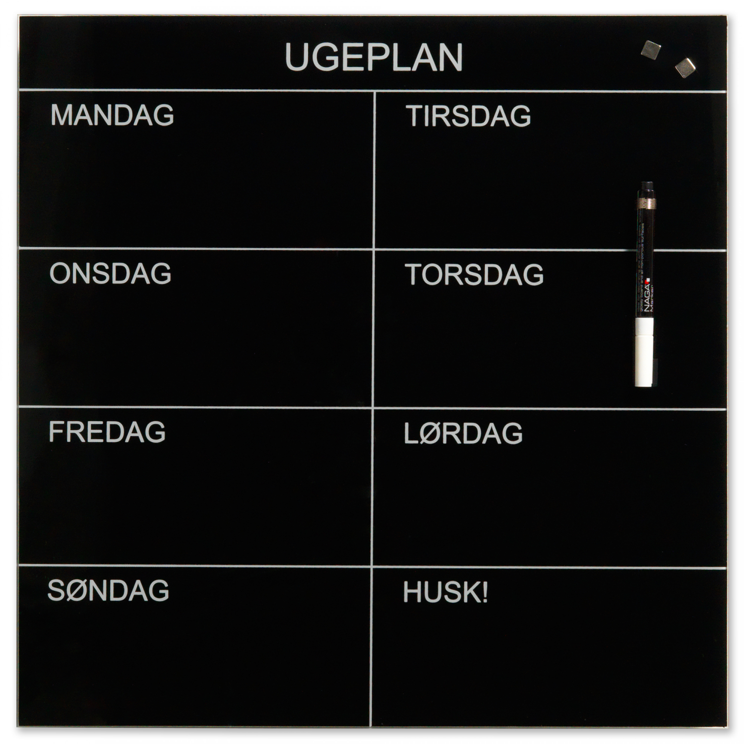Magnetisk glas uge tavle 45 x 45 cm. Sort Dansk tekst. Skriv på tavlen med en marker, og sæt ting op på den med super stærke magneter. Gør det nemt at planlægge ugens aktiviteter. Tavlen leveres komplet med skruer, rawplugs, ophængs skabelon, 1 marker og 2 super stærke magneter. Leveres i gaveæske.