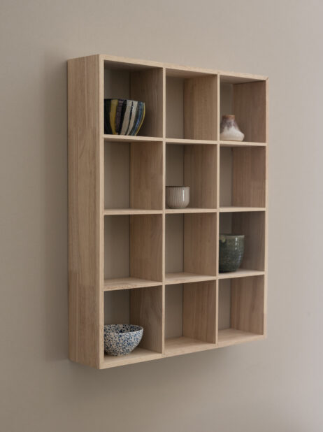Denne elegante og funktionelle hylde i egetræ er designet til at fremvise dine prydgenstande, figurer eller samlerobjekter med stil. Med sine 12 kvadratiske fack (12 x 12 cm) er Nooka Minihylla den perfekte løsning til at organisere og dekorere dit hjem.