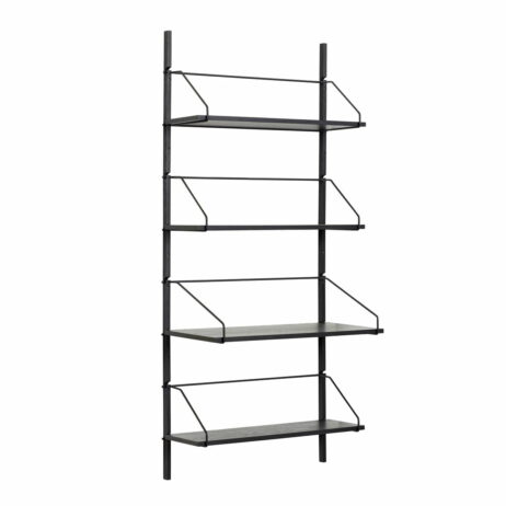 Stativet er fremstillet helt enkelt og elegant i sortmalet jern, så vægstativet får et wired udtryk. Hylderne er flytbare så du kan bytte rundt på rækkefølgen på hylderne eller fjerne en hylde for at få mere højde til hylden under.