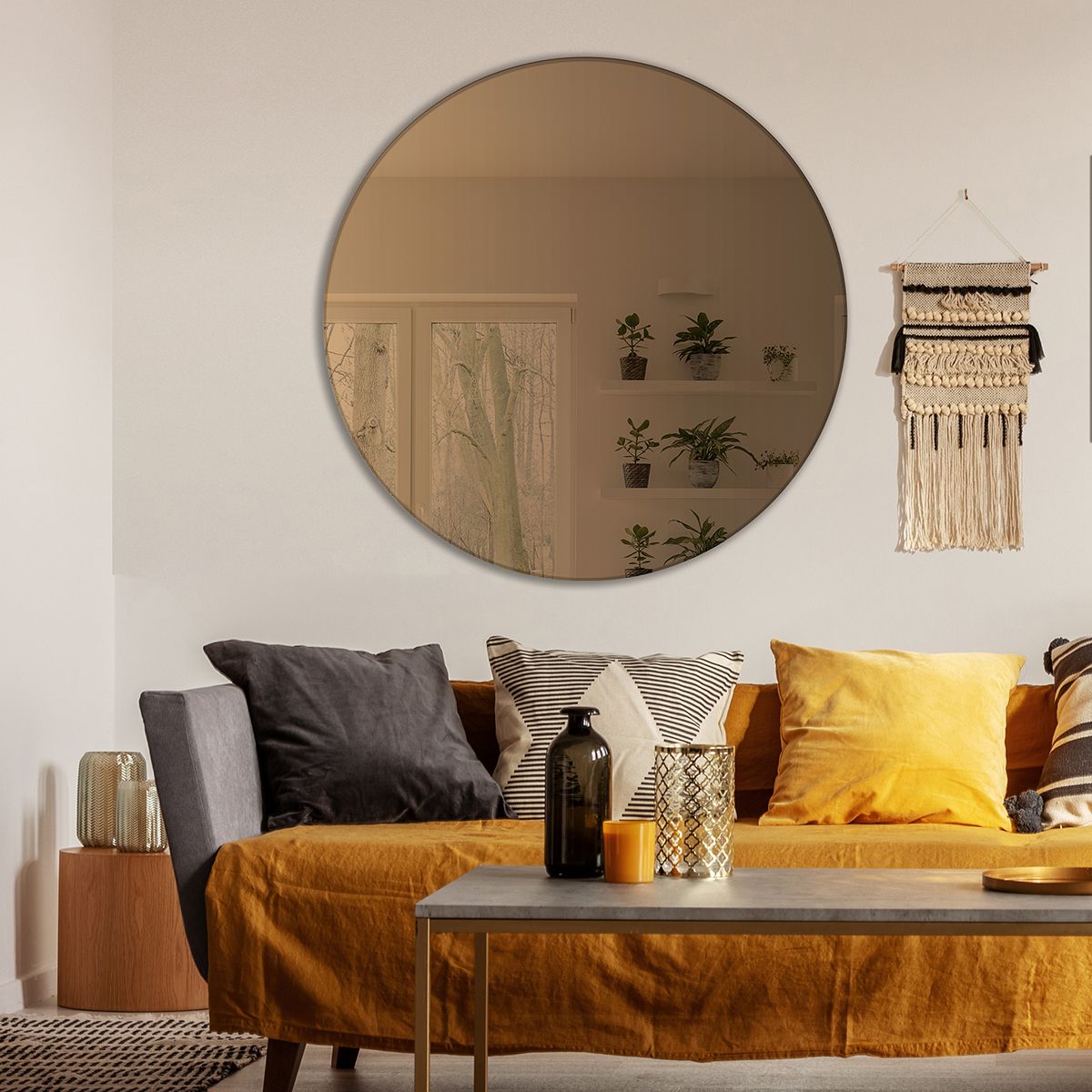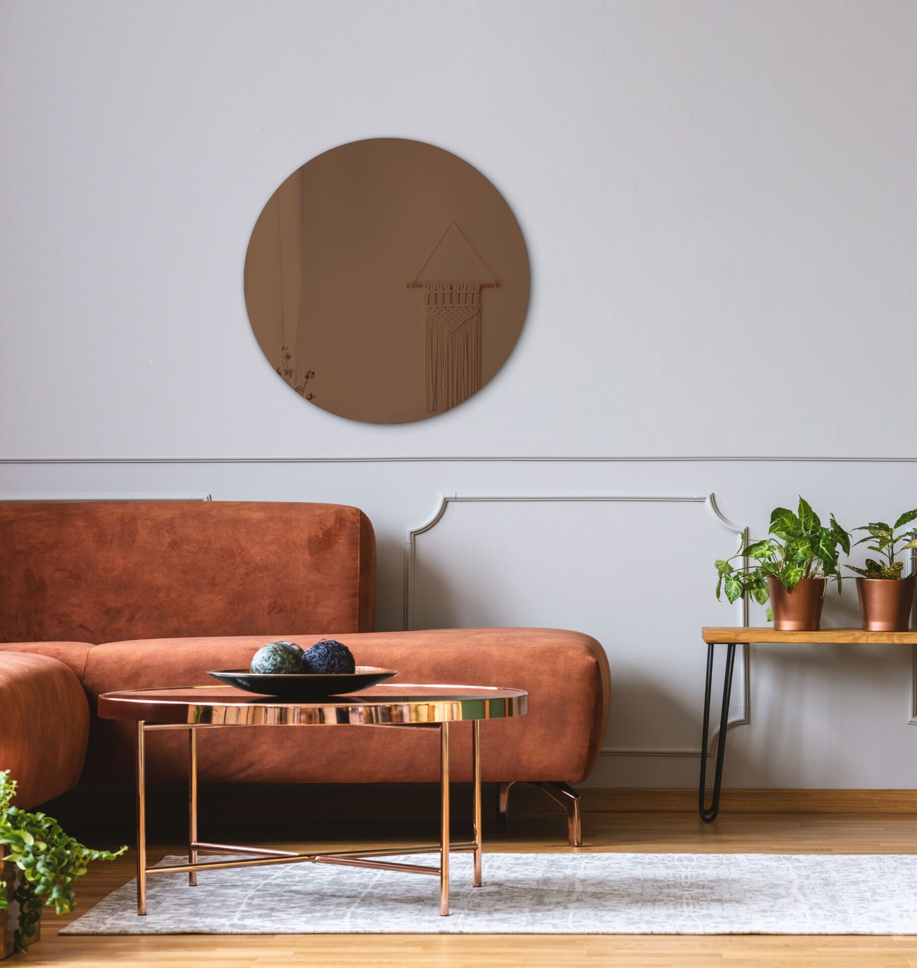 Dette smukke cirkulære spejl er elegant udført med en bronze-finish, der tilfører det et tidløst og sofistikeret udseende. Spejlet præsenterer en nahtløs design, hvor glasset strækker sig helt ud til kanten, og bagsiden er omhyggeligt fremstillet med en smuk MDF-bagplade for ekstra holdbarhed.