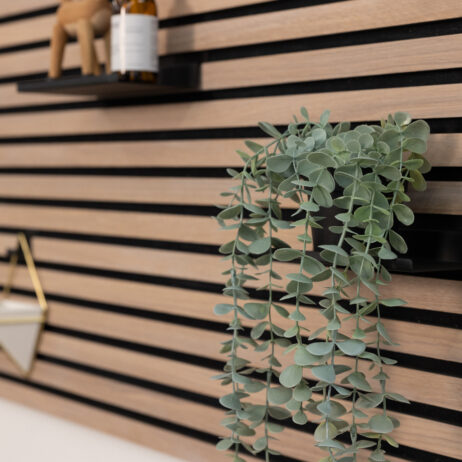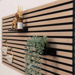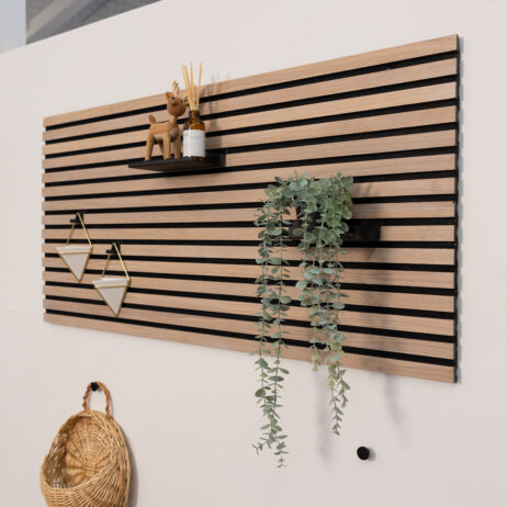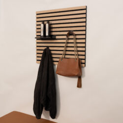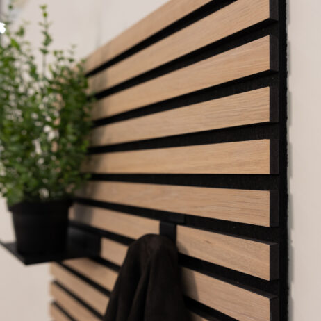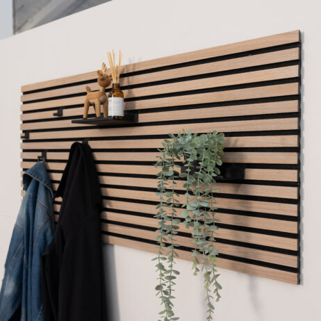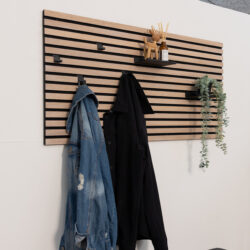 Dette panel er ekstra forstærket til brug med knager og hylder. Lamellerne kan klare 2 knager pr. lamel og max 4kg pr. knag.