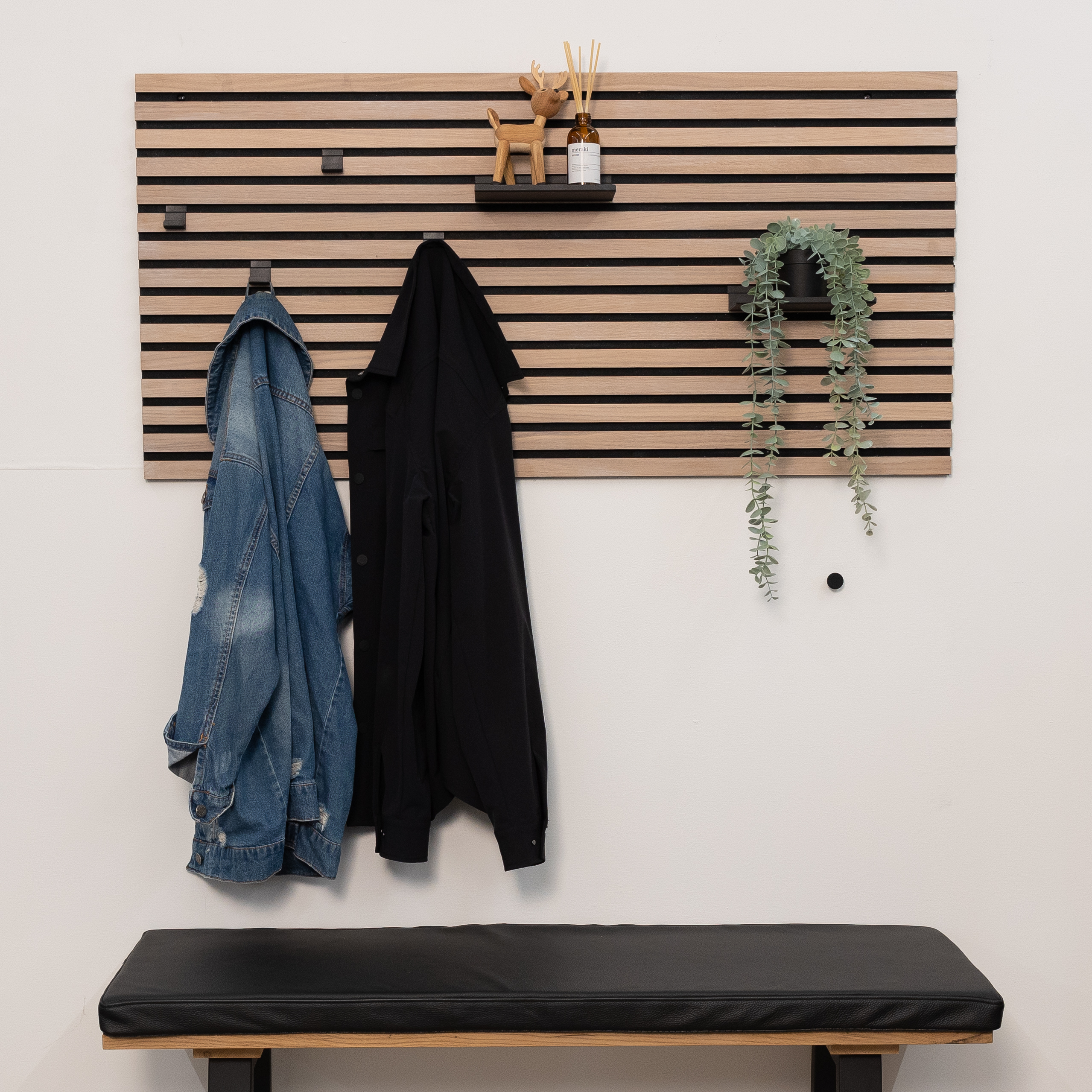 Bemærk: Knagpanelet leveres ubehandlet, og du skal selv påføre olie – Påføres let med en klud, viskestykke eller lignende i et tyndt lag. Vi anbefaler stærkt at oliere panelet, da fugt fra overtøj kan efterlade mærker på panelet. Hæng ikke vådt tøj direkte på finéren.