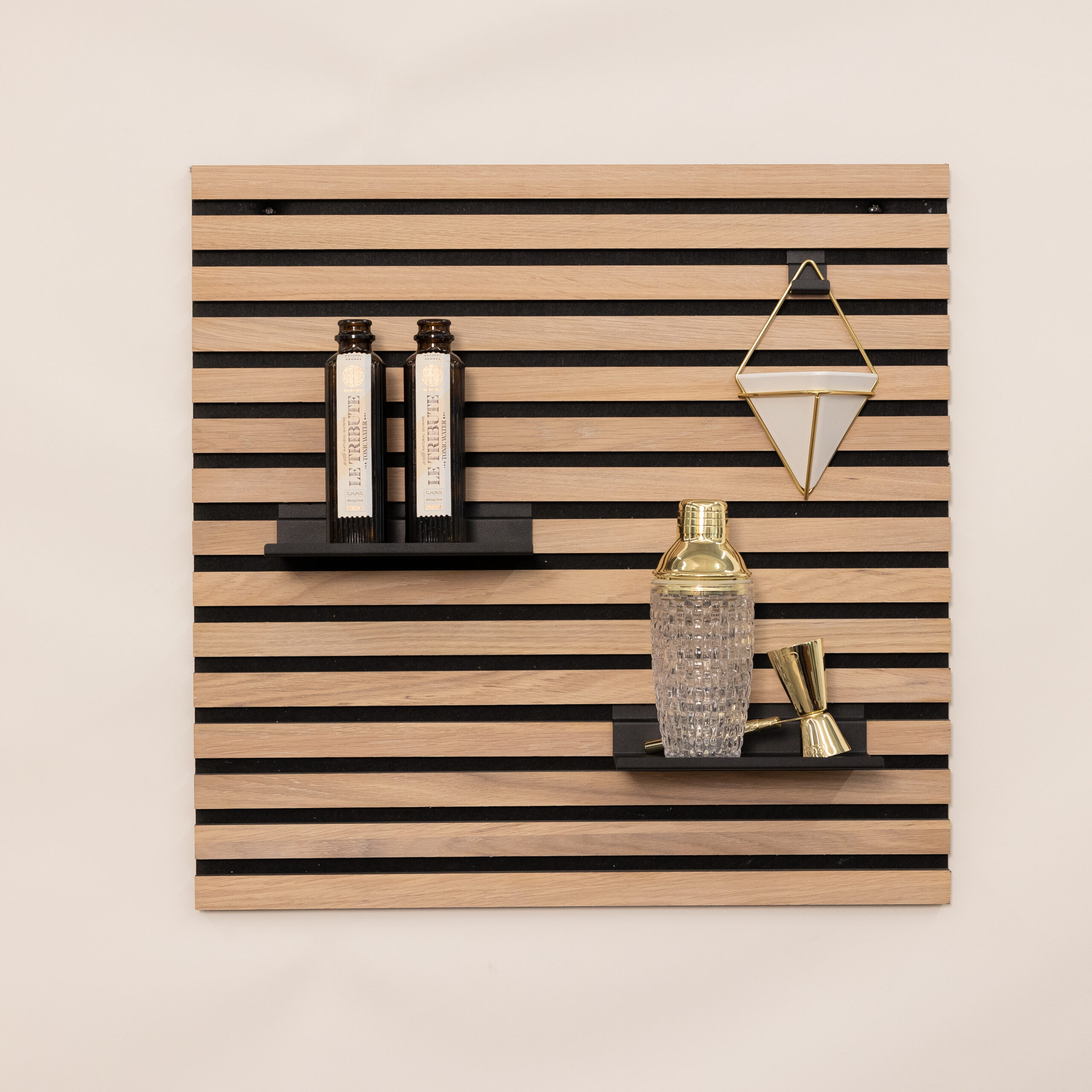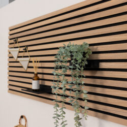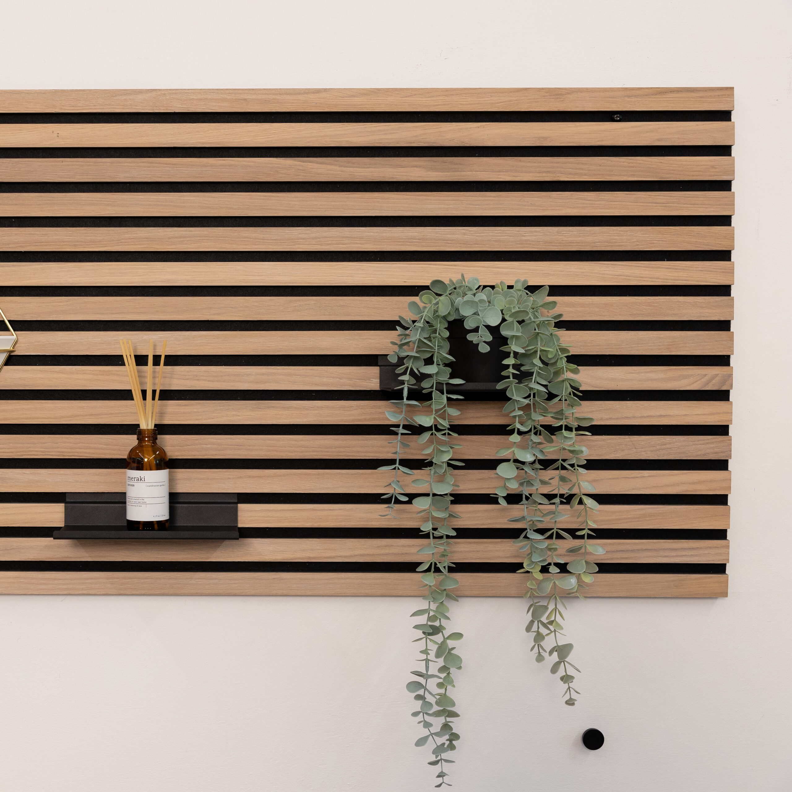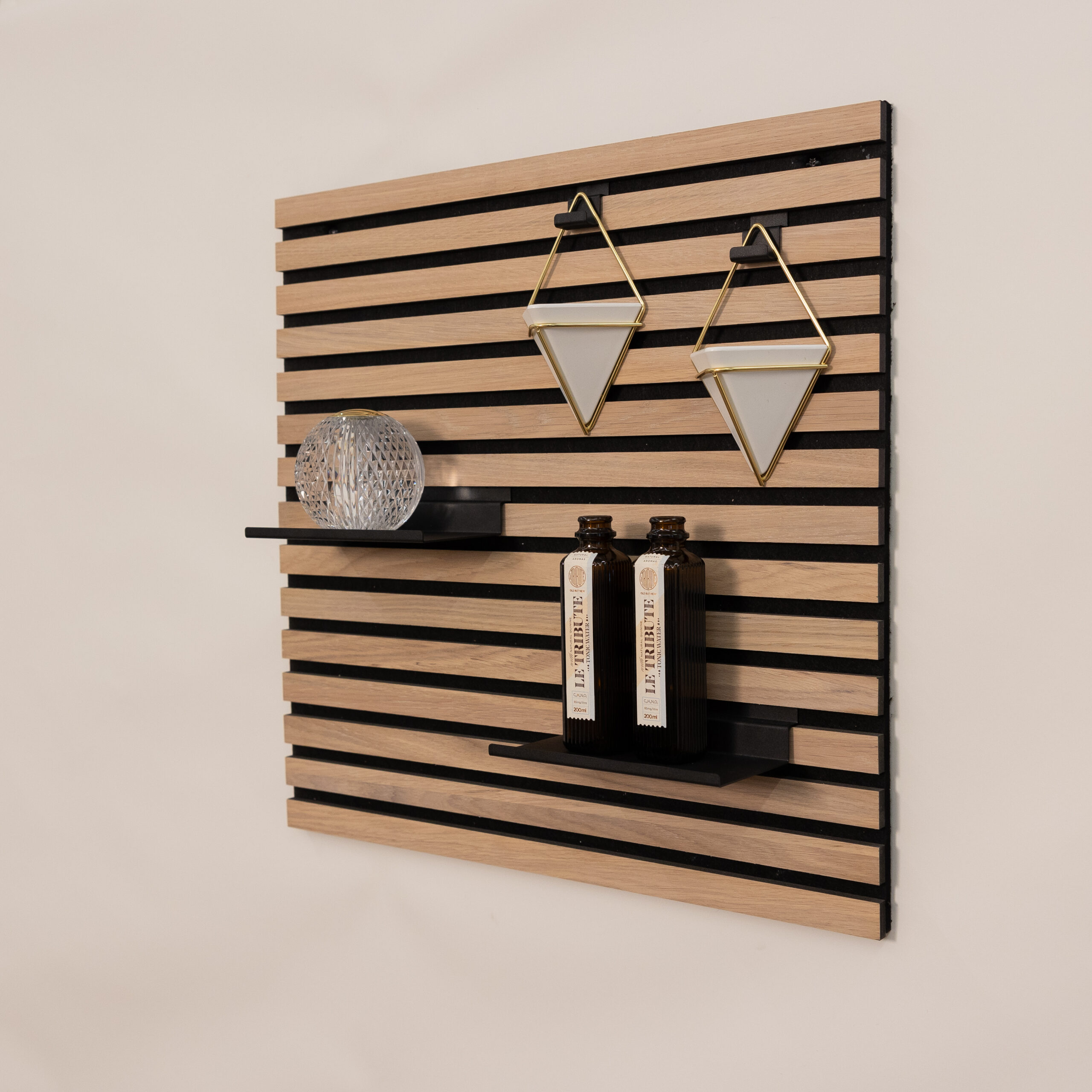 Dette panel er ekstra forstærket til brug med knager og hylder. Lamellerne kan klare 2 knager pr. lamel og max 4kg pr. knag.