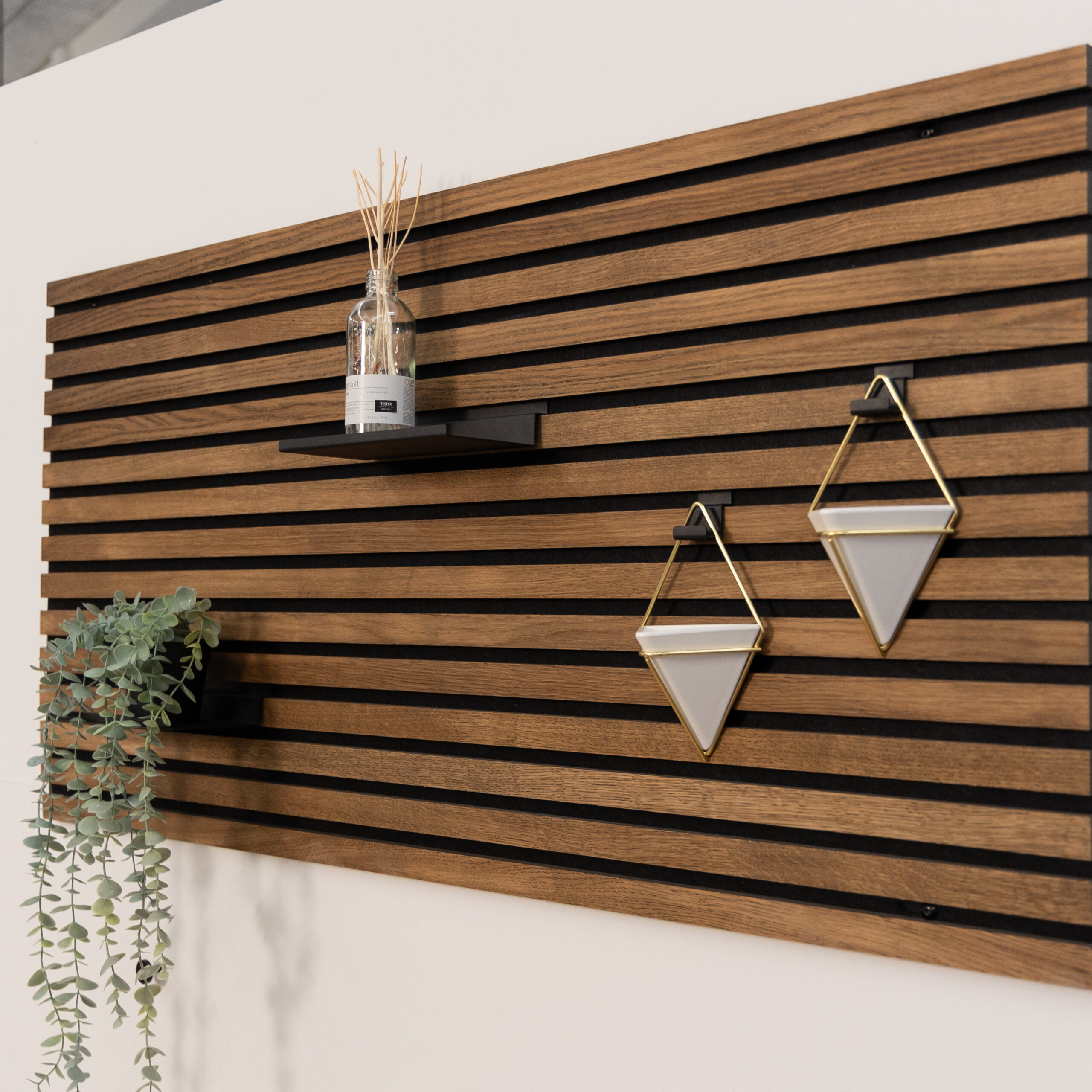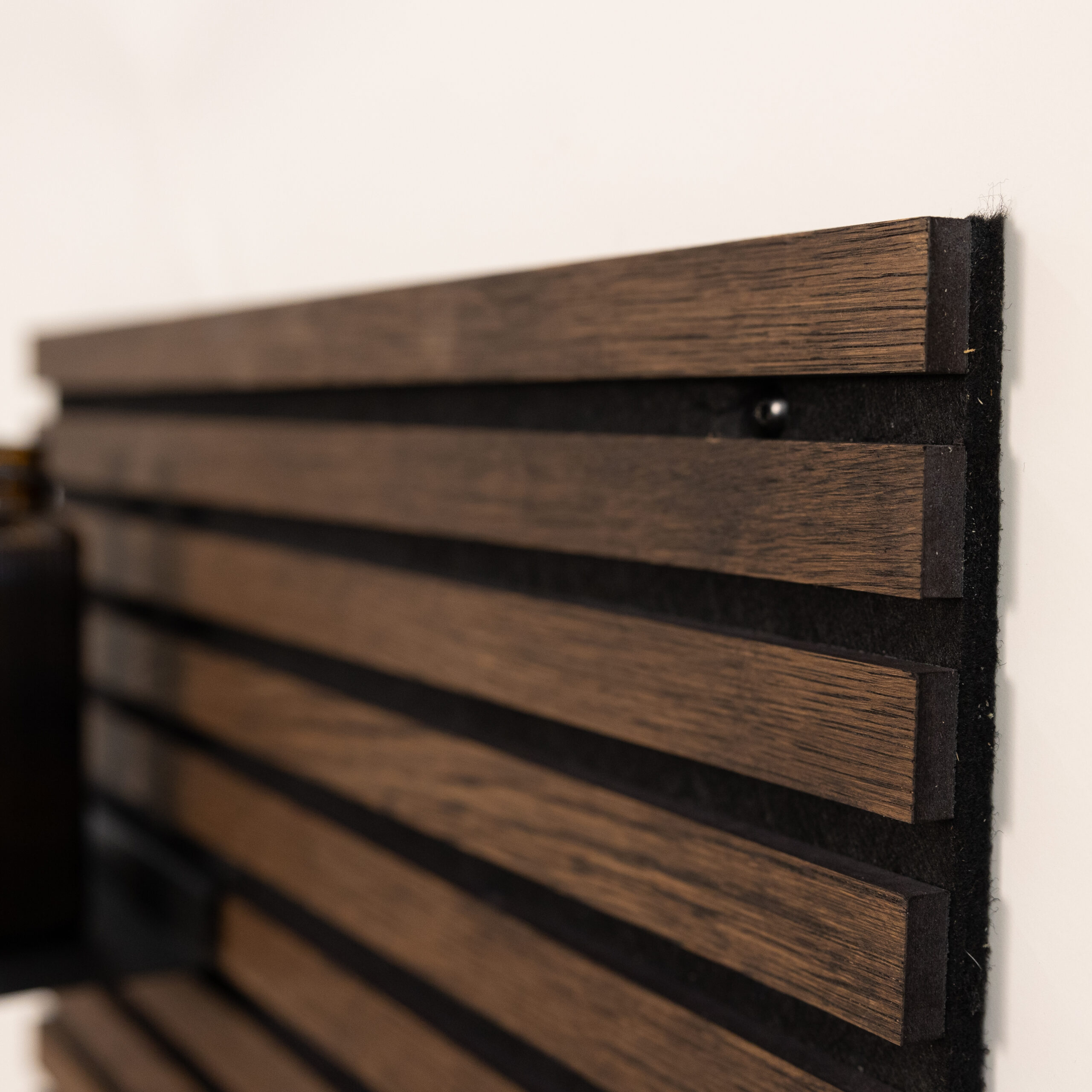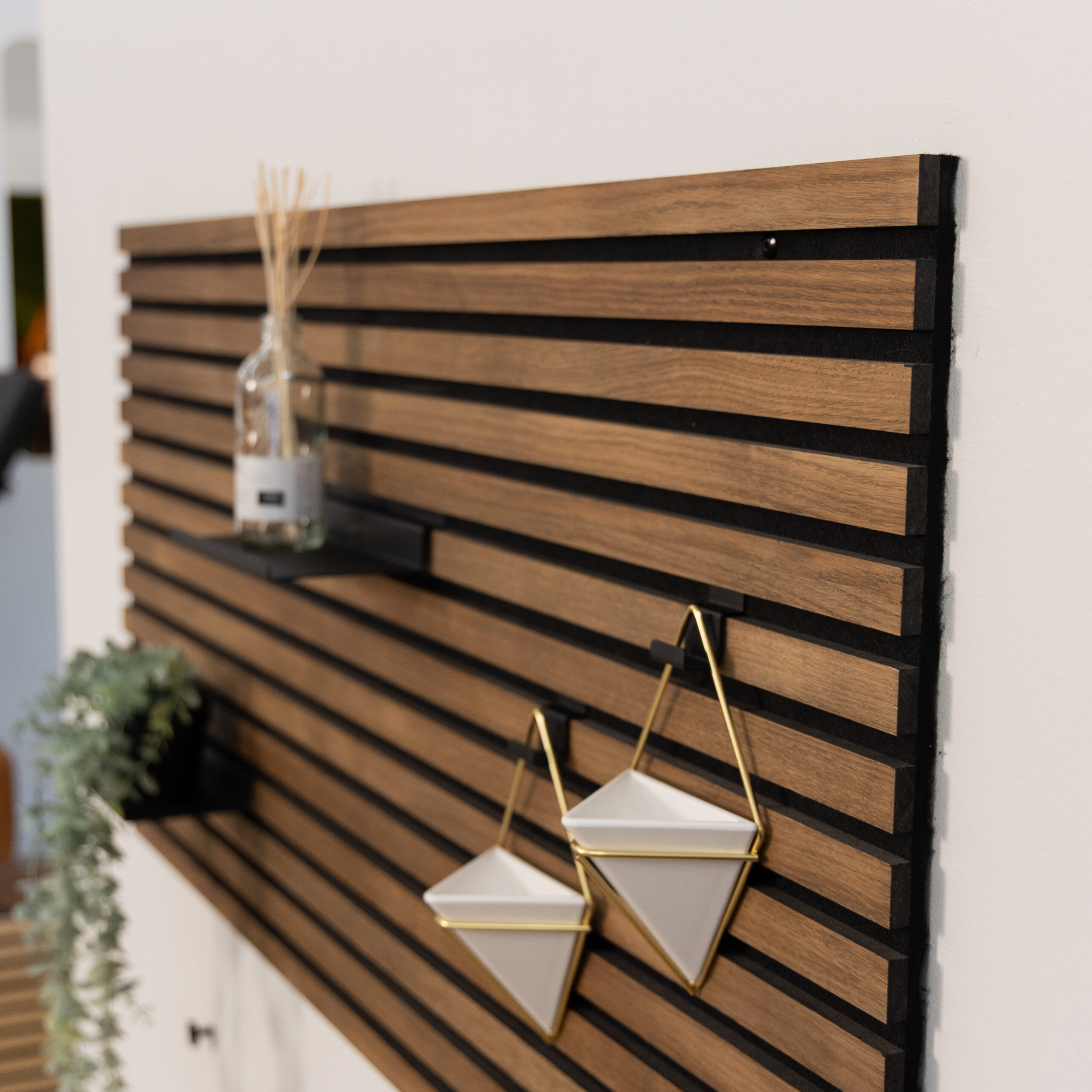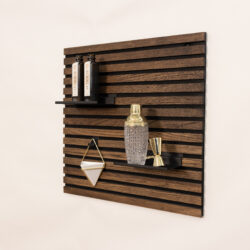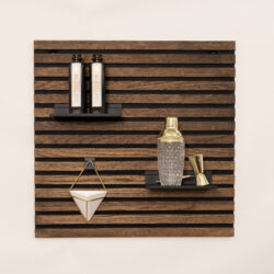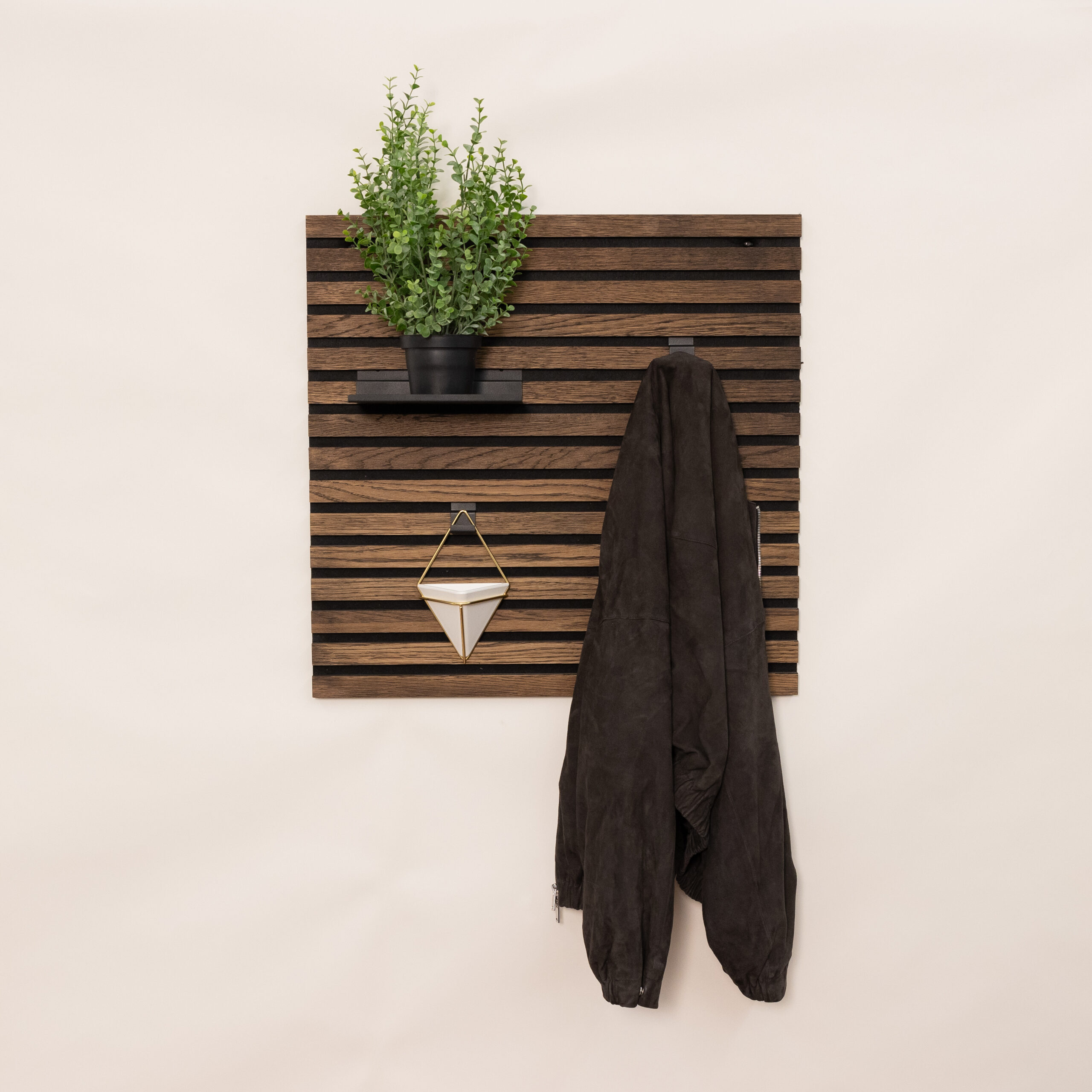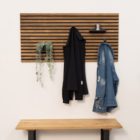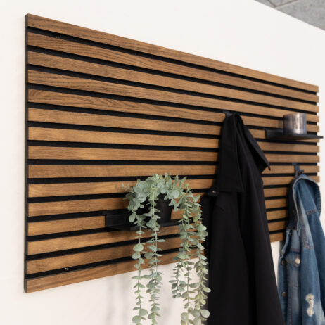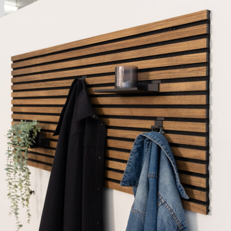 Dette panel er ekstra forstærket til brug med knager og hylder. Lamellerne kan klare 2 knager pr. lamel og max 4kg pr. knag.
