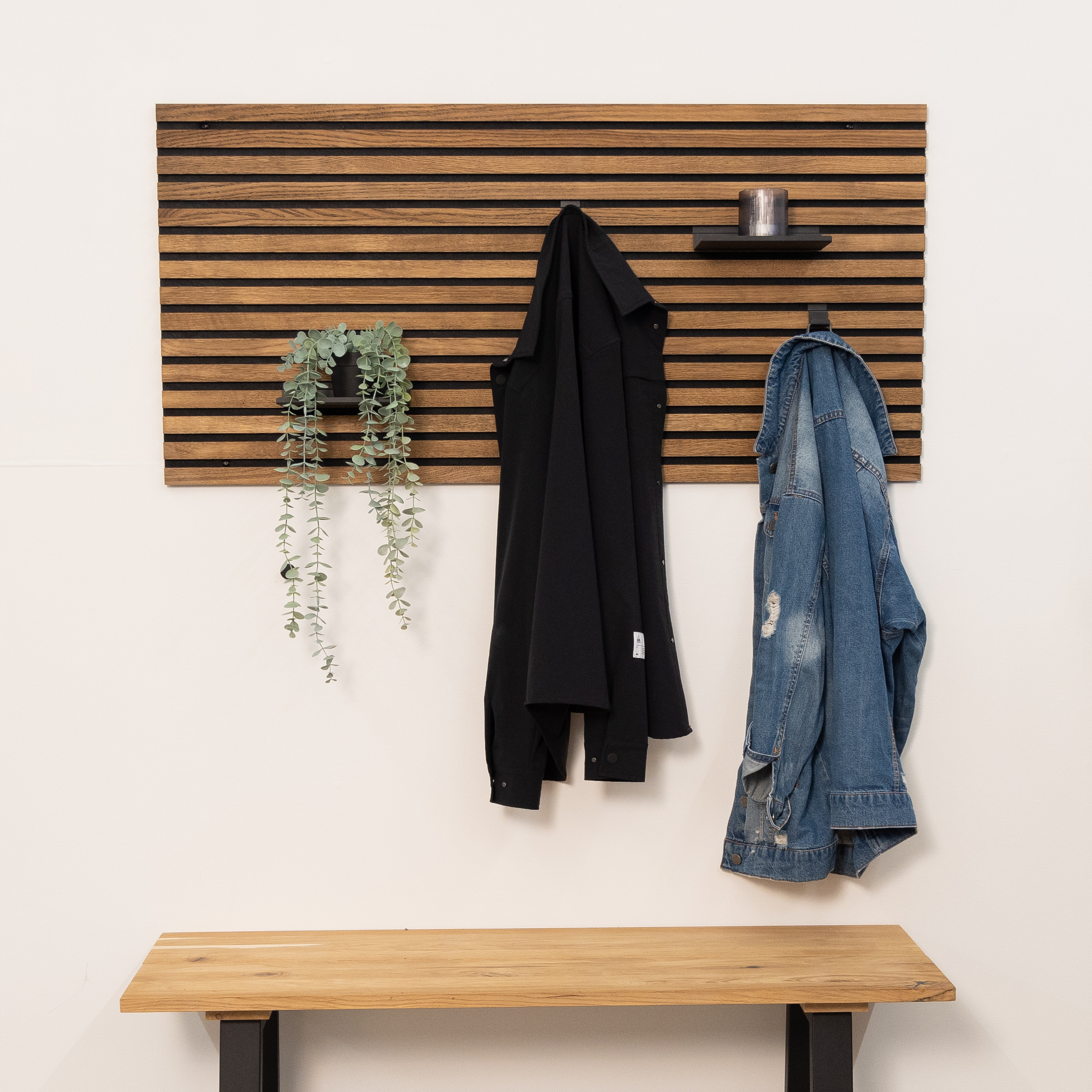 Farven på billederne er vejledende, da mængden af påført olie afgør den endelige farve. Knagpanelet leveres ubehandlet, og du skal selv påføre olie.