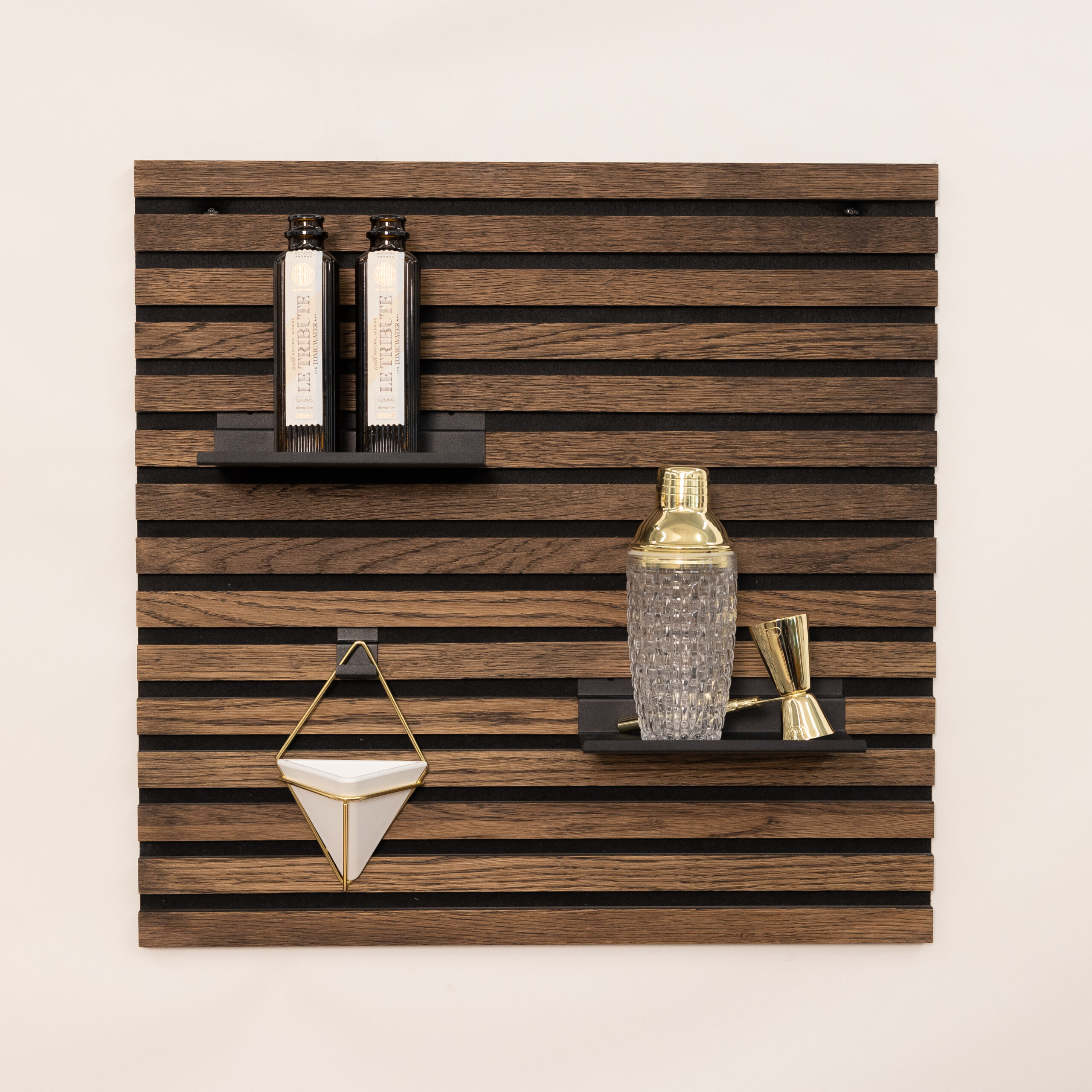 Panelet leveres med 5 knager, og du har mulighed for at tilkøbe ekstra knager og/eller hylder som tilbehør.