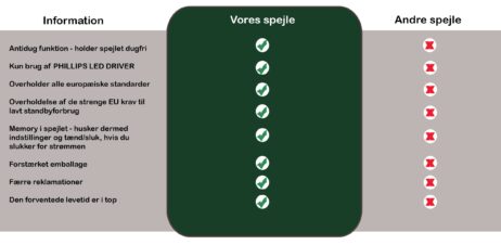 Energiklasse: F (obs på at spejlet ikke bruger meget strøm, da det typisk ikke er tændt i lange perioder, som andre lamper i hustanden)
