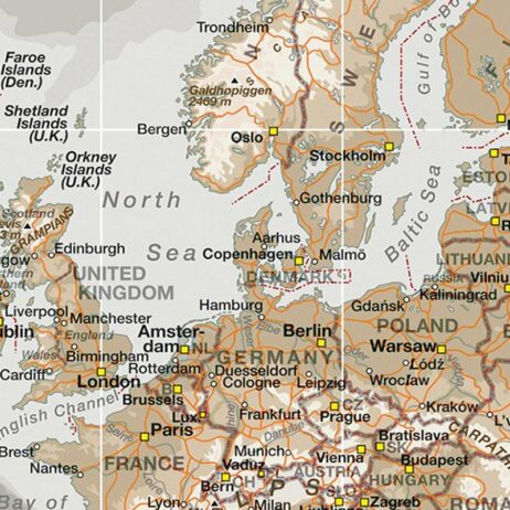 Dette verdenskort i gråtoner er opspændt på en 4 cm bred blindramme. Kortet fremstår skarpt og detaljeret, så du kan få øjne på de forskellige landes hovedstæder og deres navne. Alle navne står på Engelsk.