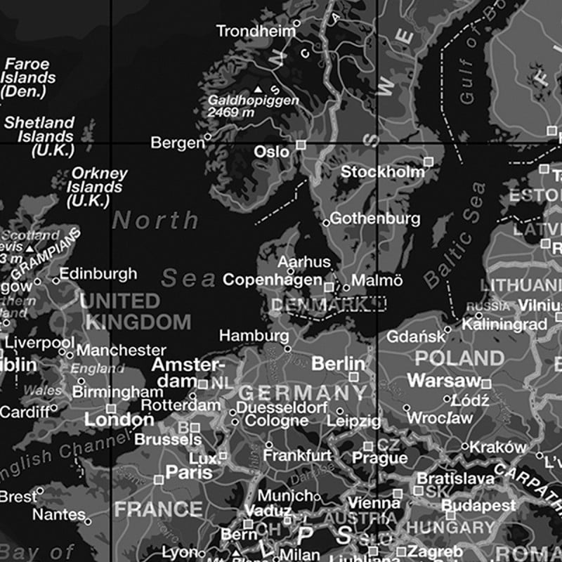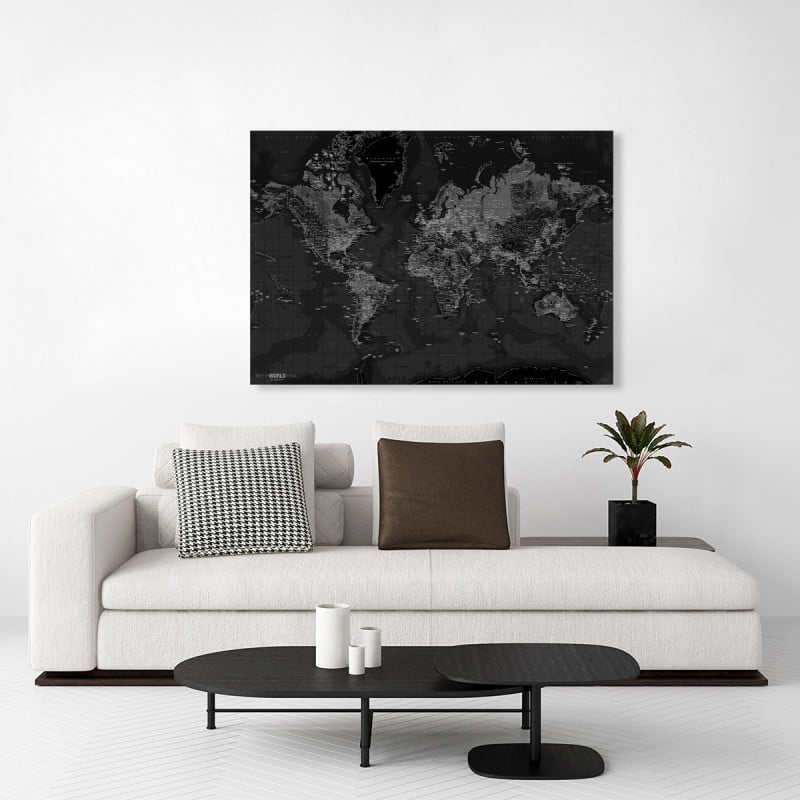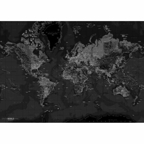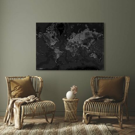 Dette verdenskort i sort/hvid er opspændt på en 4 cm bred blindramme. Kortet fremstår skarpt og detaljeret, så du kan få øjne på de forskellige landes hovedstæder og deres navne. Alle navne står på Engelsk.
