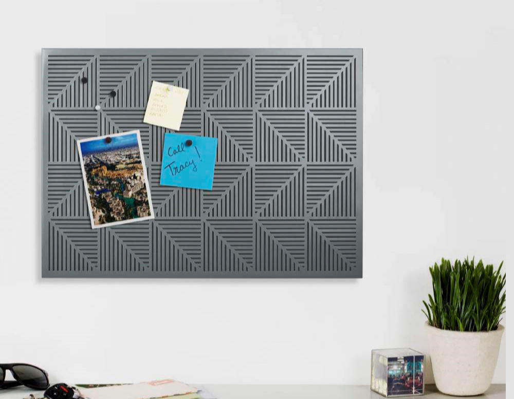 Umbras nye magnetike opslagstavle kommer nu i farven trækul. Tavlen er lavet om et metal panel med et grafisk design som giver et fremtrædende geometrisk mønster til din væg. Denne farve giver denne alsidige kontor tavle nye flotte dimensioner.