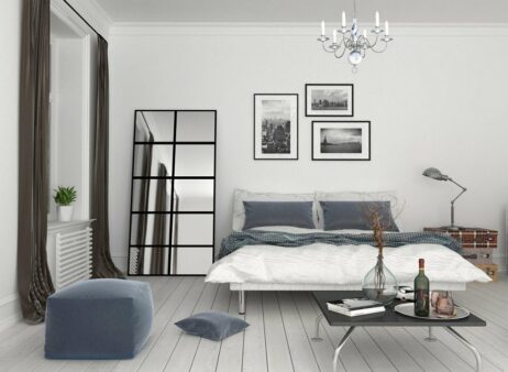 Spejlet fungerer både som et dekorativt element og en praktisk løsning til at skabe rumfornemmelse.