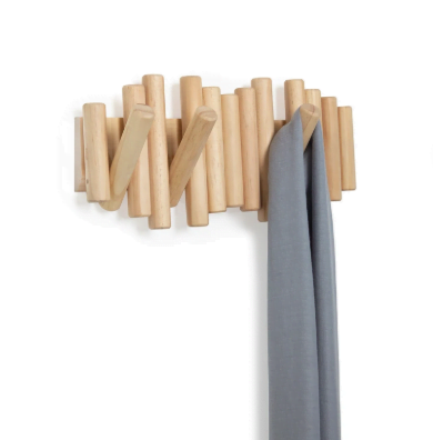 Nu er den funktionelle og dekorative knagerække fra Picket også tilgængelig i naturligt look Dens rige farve giver dybde til din væg. Når knagerne er slået op, bliver den til en alsidig tilføjelse til din væg med god effekt for rummet.
