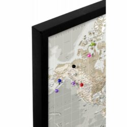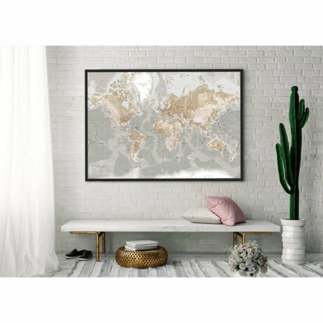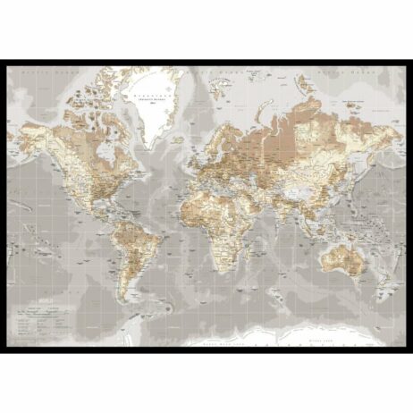 Dette verdenskort er inspireret af de helt gamle skolekort i gråtoner, og fremstår retro på den fede måde. Den retro stil bliver nænsomt brudt med en flot og stilren sort ramme.
