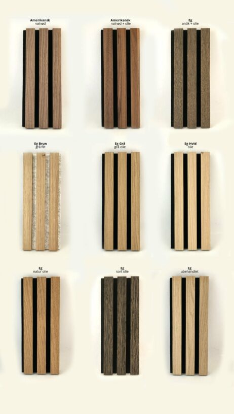 Med vores prøvepakke af Premium akustikpaneler, kan der vælges 4 stk. prøvepaneler på 30x12cm – Vælg mellem 9 forskellige varianter, og skriv i feltet ovenfor hvilke 4 varianter du ønsker.