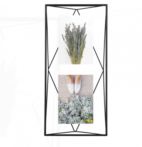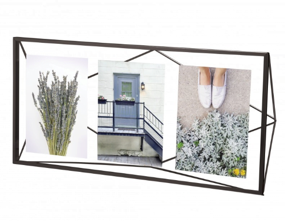 Metal ramme i sort. Rammen kan både blive placeret på et bord eller væggen. Den skaber et 3D look, hvor billederne er placeret mellem to stykker glas. Den kan holde 3 5×7” billeder horisontalt eller 2 billeder vertikalt.