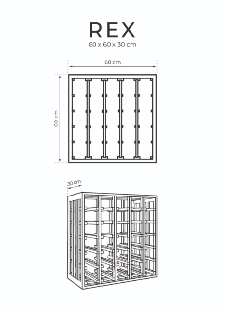 REX modulet er opdelt i fem lige store rum, og vinreolen er derfor et ideelt opbevaringssystem til 30 flasker af standard størrelse, 750 ml. Andre flaske størrelser som f.eks. halve flasker og magnumflasker passer også i denne vinreol.