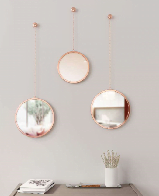 Sæt med 3 runde spejle i 2 forskellige størrelser: 1 spejl 18 cm i diameter med en 22 cm kæde og 2 spejle 22 cm i diameter med 2 kæder på 39 cm