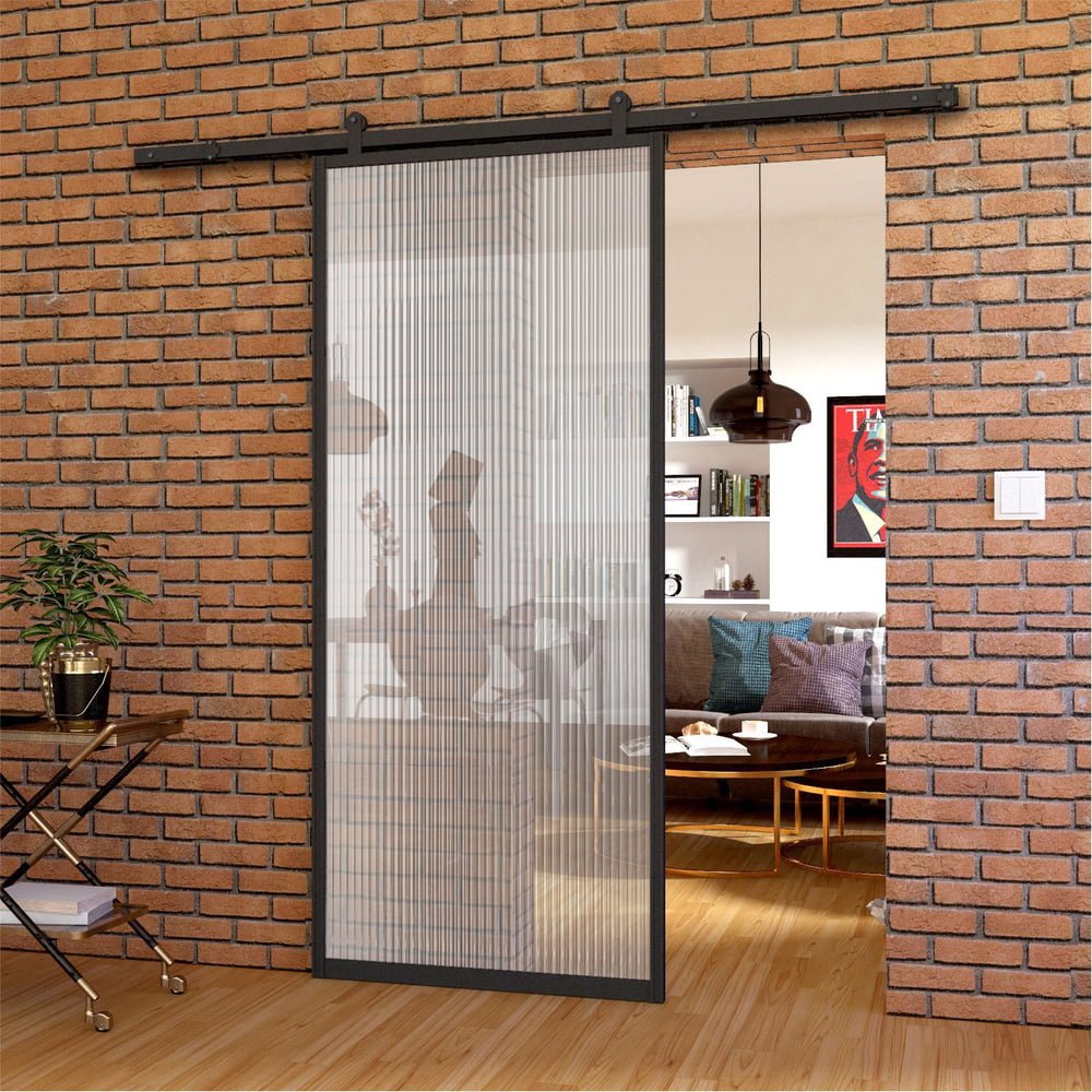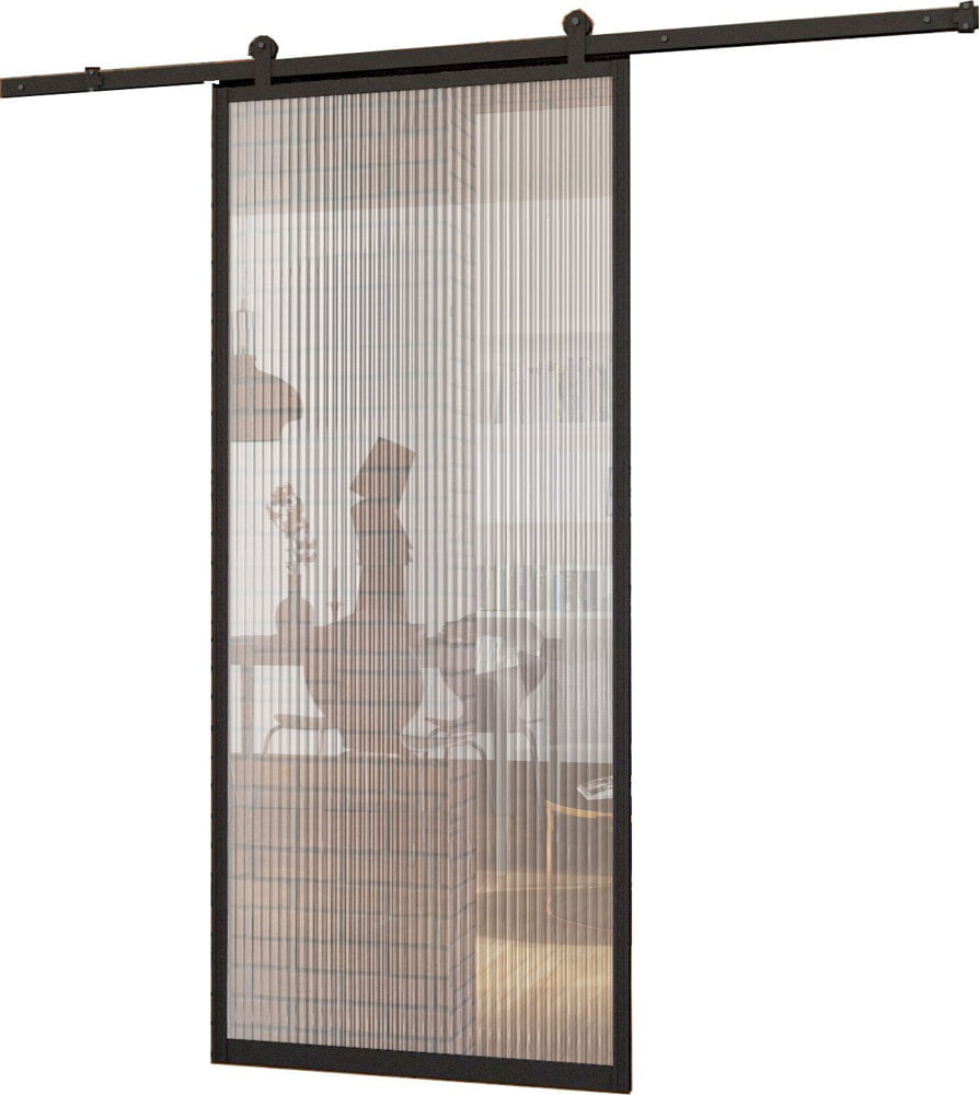 Skydedøre i aluminiumsramme med skydesystem. Hærdet riflede reeded glas (den ene side glat, den anden struktur).