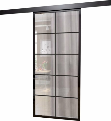 Døren fås i flere størrelser og består af Struktureret glas af 10 sektioner, der giver mulighed for en bred åbning og optimal pladsudnyttelse. Systemet er designet til at blive installeret på en glidende skinne og kan åbnes og lukkes med minimal indsats.