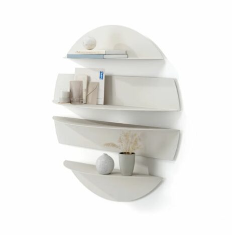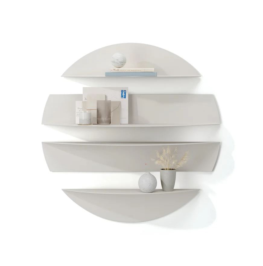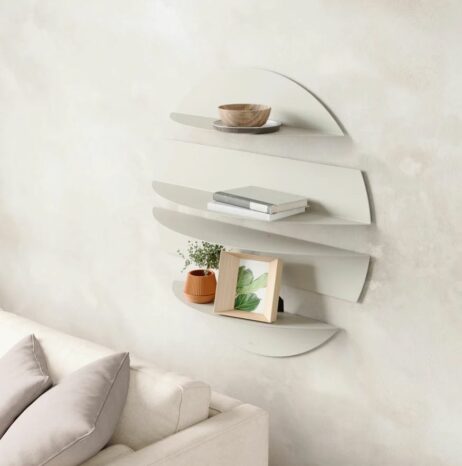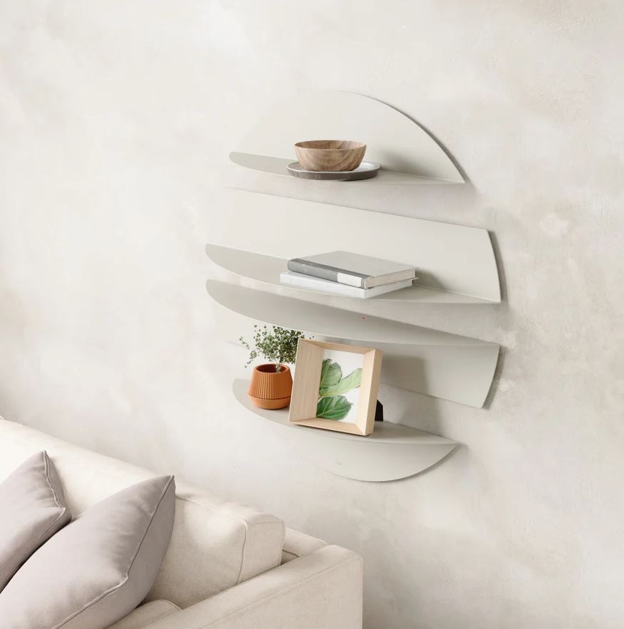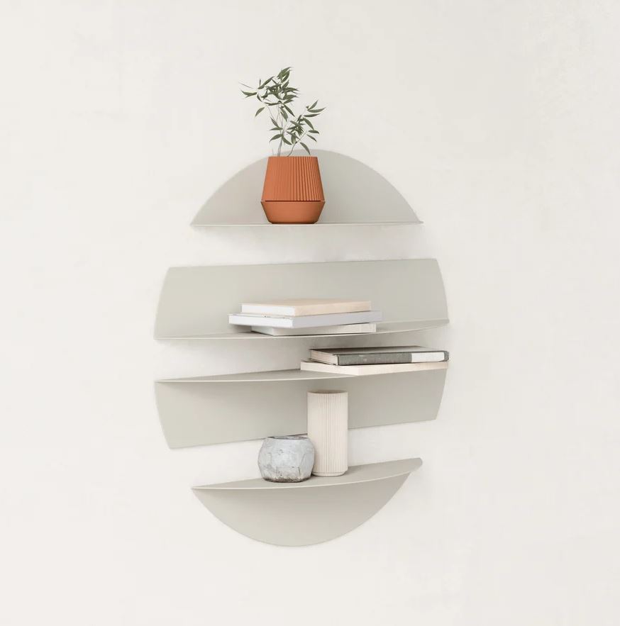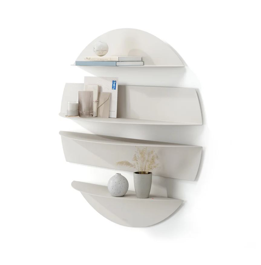 Et sæt af fire unikke hylder, fremstillet i formbøjet metal, der kombinerer opbevaring med iøjnefaldende vægudsmykning.