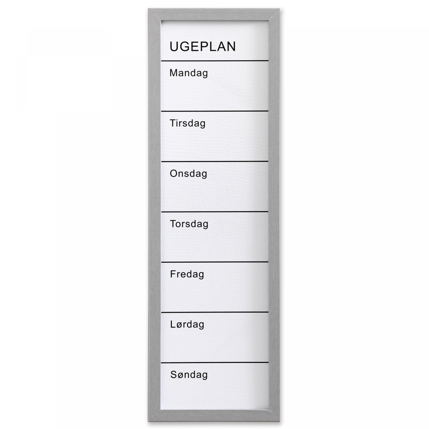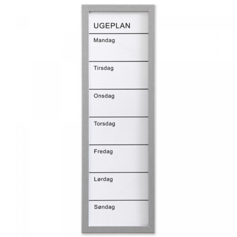 Whiteboard ugetavle 20 x 60 cm. Hvid med sølv farvet MDF ramme. Dansk tekst. Skriv på tavlen med en marker. Gør det nemt at planlægge ugens aktiviteter. Denne tavle er ikke magnetisk.
